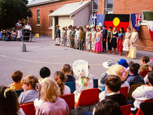 The "Grazed Knee Theatrics" group pictured had been performing in capital cities around Australia as part of the "International Year of Youth" programmes. 1 Sept. 1985